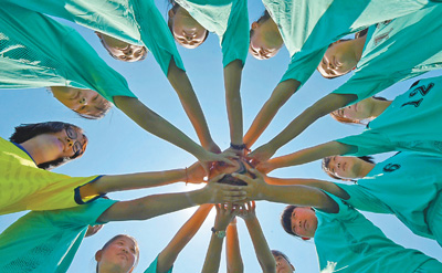 图为6月11日,姑娘们在训练前加油。 图为6月11日,姑娘们在球场上进行训练。 在沂蒙山深处的山东省淄博市沂源县西里中学,一群酷