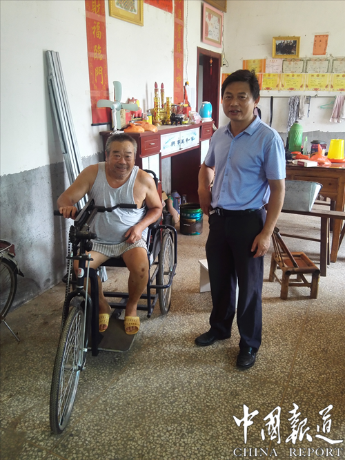 贫困户老杨腿有残疾,熊盛庭立即为他筹集了一辆轮椅车,老杨高兴地笑了。