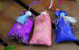 时至今日,在全国多地仍有佩戴香囊的习俗。用彩色丝线在彩绸上绣制出各种图案纹饰,缝制成形状各异、大小不等的小绣囊,内装多种芳香开窍的中草药、干花或香料,以求驱虫、避邪、安眠、保平安、传达思念等。