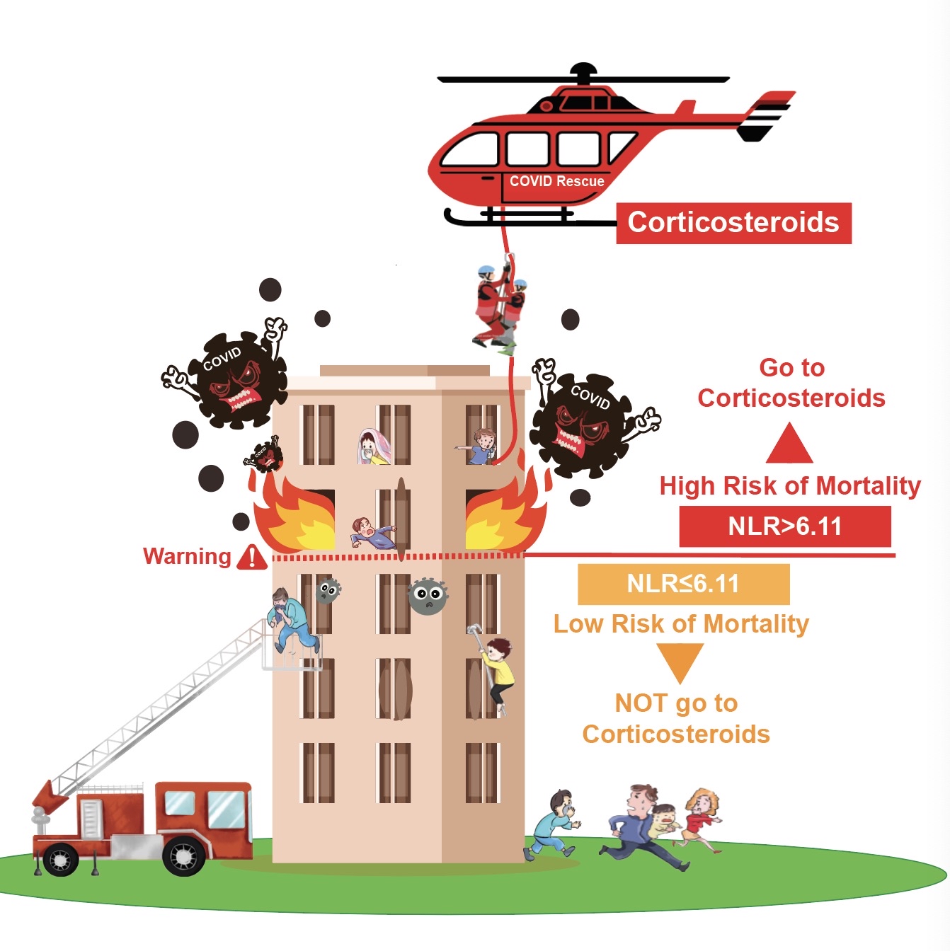 通过严格的建模计算、分析、验证,研究团队发现:“中性粒细胞—淋巴细胞比值(NLR)”与新冠患者的死亡风险以及使用激素是否获益密切相关。当NLR值高于6.11时,使用激素和降低死亡率改善预后显著相关;当NLR值低于6.11时,使用激素不仅不能获益,反而会增加高血糖和感染的风险。